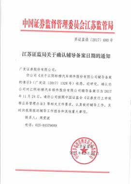 公司已收到江蘇證監(jiān)局關(guān)于確認(rèn)輔導(dǎo)備案日期的通知,公司將會按照中國證監(jiān)會《證券發(fā)行上市保薦業(yè)務(wù)管理辦法》等相關(guān)文件要求,認(rèn)真做好輔導(dǎo)工作,及時向江蘇證監(jiān)局報送輔導(dǎo)工作報告和其他重大事項。