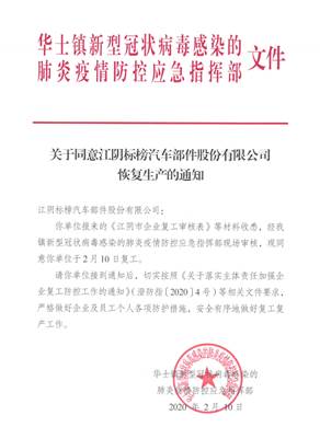 公司積極向江陰市政府申請復工,于正月十七接華士鎮(zhèn)新型冠狀病毒感染的肺炎疫情防控應急指揮部文件通知, 公司正式啟動了生產計劃編排、關鍵設備物料拉動和員工召回等各項具體工作,在全面做好工作區(qū)域消毒和員工防護的前提下,緊急開展復工,保證產品準時交付。