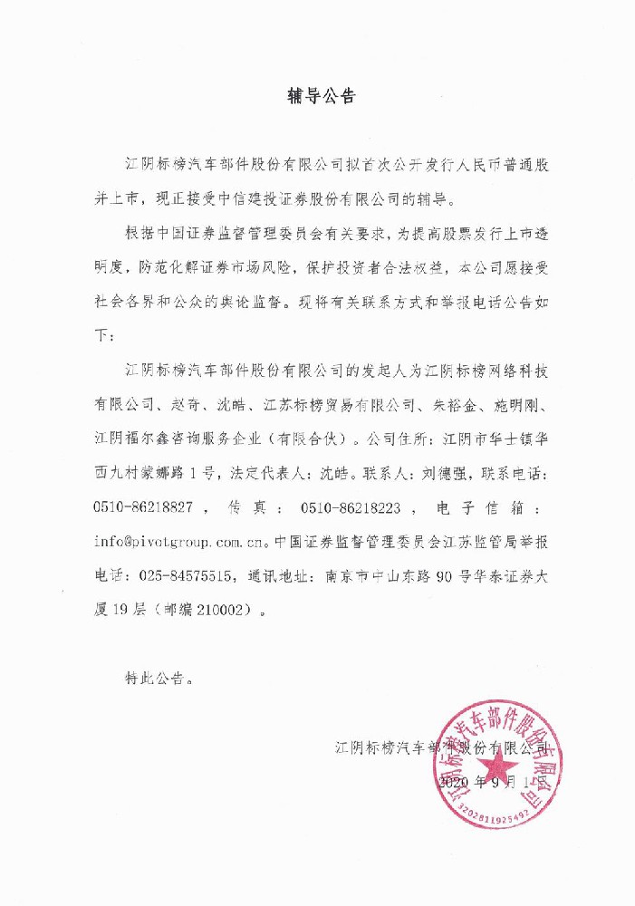江陰標(biāo)榜汽車部件股份有限公司擬首次公開發(fā)行人民幣普通股并上市,現(xiàn)正接受中信建投證券股份有限公司的輔導(dǎo)。